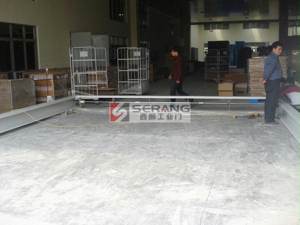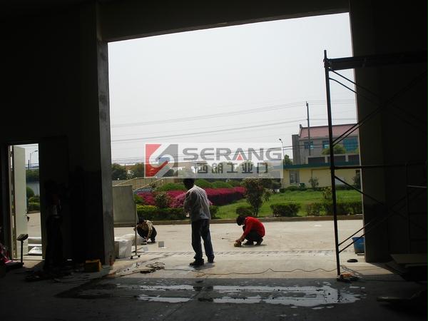 上图为:无锡地磁感应堆积快速门,苏州西朗门业安装人员正在切割地磁。