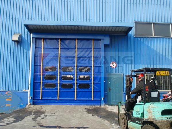 堆积门帘布:快速门专用高密度工业基布,厚度为0.8-1.2mm,防火级别达到欧洲NF-P92-503标准,黄色、蓝色、白色或全透明等多种颜色可供选择